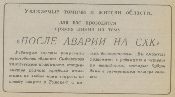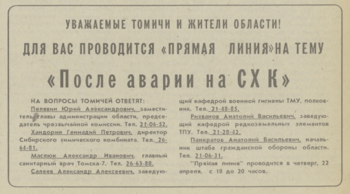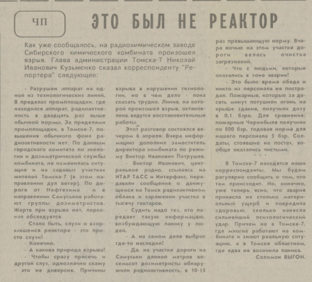 Выпуск открывает публикация о недавней аварии, заметка совсем короткая, заголовок - явно успокаивающий: "Это был не реактор". Очевидно, она не закрывает всех вопросов и не в состоянии снять страхов и панических настроений, иначе чем объяснить, что в следующих апрельских номерах этой теме будет посвящено всё больше статей, причем каждая следующая будто объемнее предыдущей?