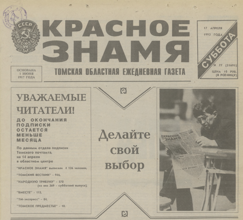 "Красное знамя. Суббота", № 77, 17.04.1993, с. 1