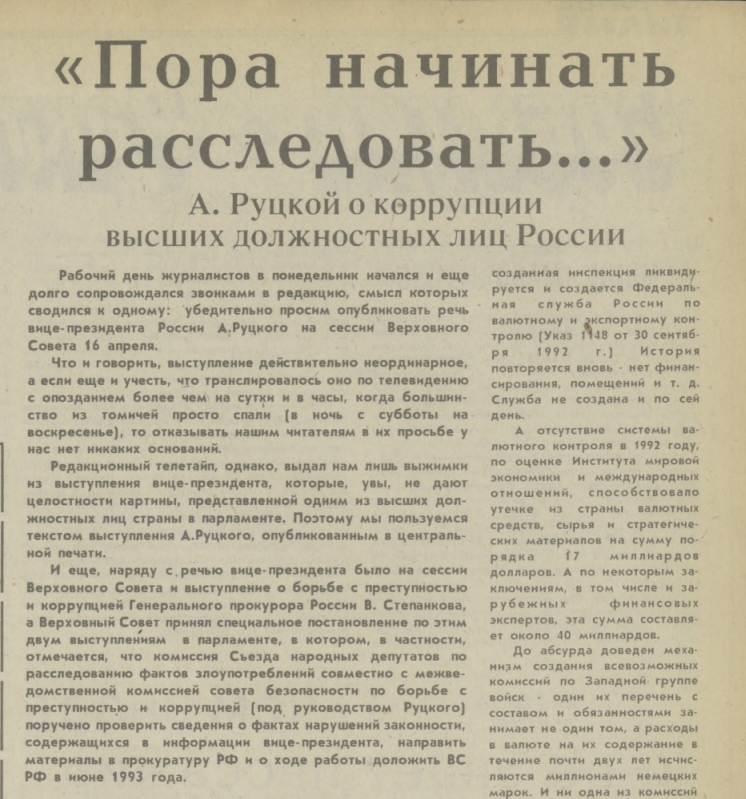 В этом номере приоритет отдан информации о Президенте России и его деяниях. «Борис Ельцин считает, что помощь запада помешает коммунистам прийти к власти», «Б. Ельцин сообщил о намерении компенсировать вклады населению», рядом статья о «подачках США» для проведения реформ. Постфактум такие материалы читать странно.