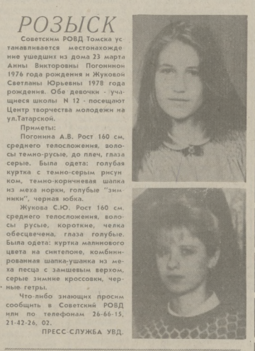 А рядом соседствует статья о тенденциях моды «Декольте не грех» и сообщения о розыске людей с фотографиями пропавших девушек.